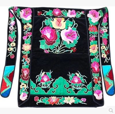 背带 (Baby carrier),古称“襁褓”,又称“小孩背带”、“娃崽背带”或“背扇”,在以农耕为主要经济方式的中国西南地区,生活环境的艰辛,使得许多母亲在下地干活或者翻山越岭走亲戚和赶圩时,也要背着孩子走。她们用一块长宽布,中部护着婴儿背部,从胯下兜起孩子的臀部,包裹着孩子的背部背在背上,背带两头从肩上绕往胸前,交叉经腋下绕回婴儿背后,再交叉经婴儿胯下,托起小儿臀、腿,再绕往母亲胸前、打结布两头系于腰间,形成最简单的“摇篮”。可以想象,宝宝们伏在母亲背上,随母亲的劳作晃动,伴随母亲爱心的跳动摇晃入睡,是何等的甜蜜。除了背带之外,贵州台江施洞地区当地苗族妇女,有时候也以围腰来背小孩。依照部位的不同,背带由背带心、背带盖、骑片以及背带带组成,并根据使用的时宜分为日用和节庆两种,居家或赶场用的背带简洁朴素,无花或少花,以耐洗的材质为主;节庆用的背儿带,则做工讲究且花样精美。贵州雷山地区背扇、绣法有:剪布包边+插针绣、插针绣也可以叫做平绣、但是插针绣比平绣更加有层次感和精密一些、背面上比较抽象的牡丹和喜鸟儿、其意义为富贵吉祥、喜事连连!