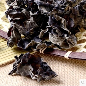 黑木耳子实体胶质,成圆盘形,耳形不规则形,直径3-12厘米。新鲜时软,干后成角质。口感细嫩,风味特殊,是一种营养丰富的著名食用菌。100克干黑木耳中水分10.9克、蛋白质10.6克、脂肪0.2克、碳水化合物65.5克、热量306千卡、粗纤维7.0 克、灰分5.8克、钙357毫克、磷201毫克、铁185毫克、胡萝卜素0.03毫克、硫胺素0.15毫克、核黄素0.55毫克、烟碱酸2.7毫克和多重矿物质。水发木耳蛋白质极低,百克含1.5克。有益气、充饥、轻身强智、止血止痛、补血活血等功效。富含多糖胶体,有良好的清滑作用,是矿山工人、纺织工人的重要保健食品。还具有一定的抗癌和治疗心血管疾病功能等等。