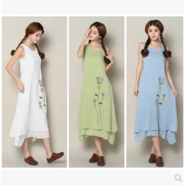 • 商品名称:文艺范棉麻荷花印花假两件不规则连衣裙长裙