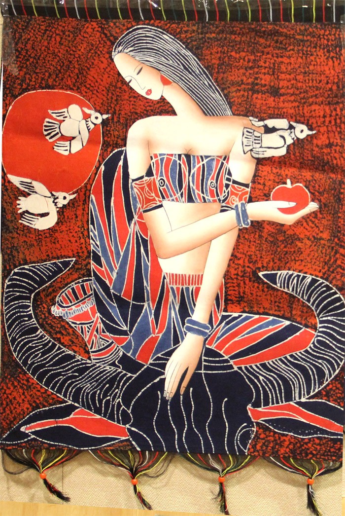 重彩画重彩技术跟蜡染工艺结合的工艺品,是用优质白布在染缸里用靛蓝(苗族专用染料)染成深蓝色。然后蜡染师傅在上面绘出各种艳丽的图形。在装婊于下方有穗穿上珠子的布上。它具有颜色丰富、艳丽,线条突出,色彩丰厚,少数民族风情和历史文化,具有浓郁的民族的地方特色。