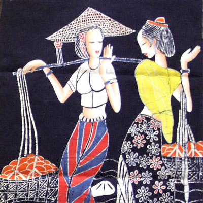 重彩画重彩技术跟蜡染工艺结合的工艺品,是用优质白布在染缸里用靛蓝(苗族专用染料)染成深蓝色。然后蜡染师傅在上面绘出各种艳丽的图形。在装婊于下方有穗穿上珠子的布上。它具有颜色丰富、艳丽,线条突出,色彩丰厚,少数民族风情和历史文化,具有浓郁的民族的地方特色。