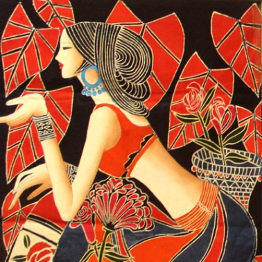 重彩画重彩技术跟蜡染工艺结合的工艺品,是用优质白布在染缸里用靛蓝(苗族专用染料)染成深蓝色。然后蜡染师傅在上面绘出各种艳丽的图形。在装婊于下方有穗穿上珠子的布上。它具有颜色丰富、艳丽,线条突出,色彩丰厚,少数民族风情和历史文化,具有浓郁的民族的地方特色。