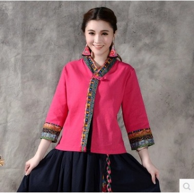 • 商品名称:民族风棉麻盘扣拼接撞色田园风短款七分袖上衣衬衫