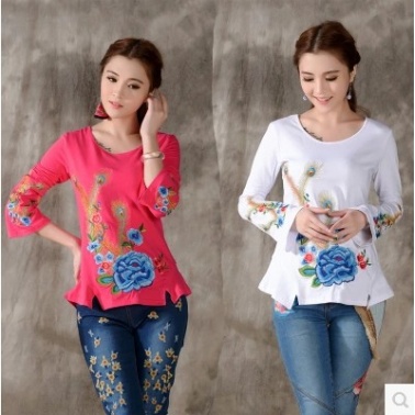 • 商品名称:民族风 休闲绣花开叉下摆 圆领长袖t恤打底衫